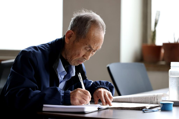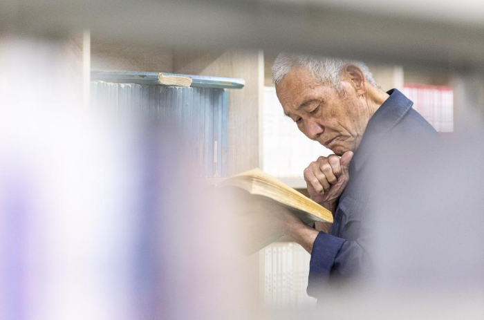 4月23日,一位老人在浙江省湖州图书馆读书。