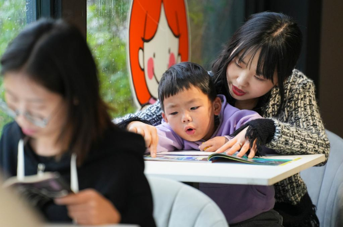 4月23日,在浙江省湖州市德清县钟管镇“干山小镇农家书屋”,一名小朋友在大人的陪伴下读书。