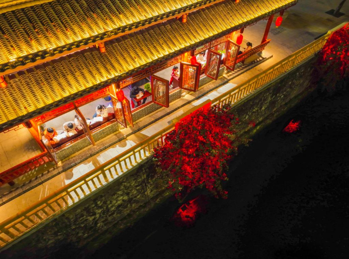 4月20日晚,人们在广西金秀瑶族自治县金秀镇荣兴社区24小时智慧书屋内读书(无人机照片)。