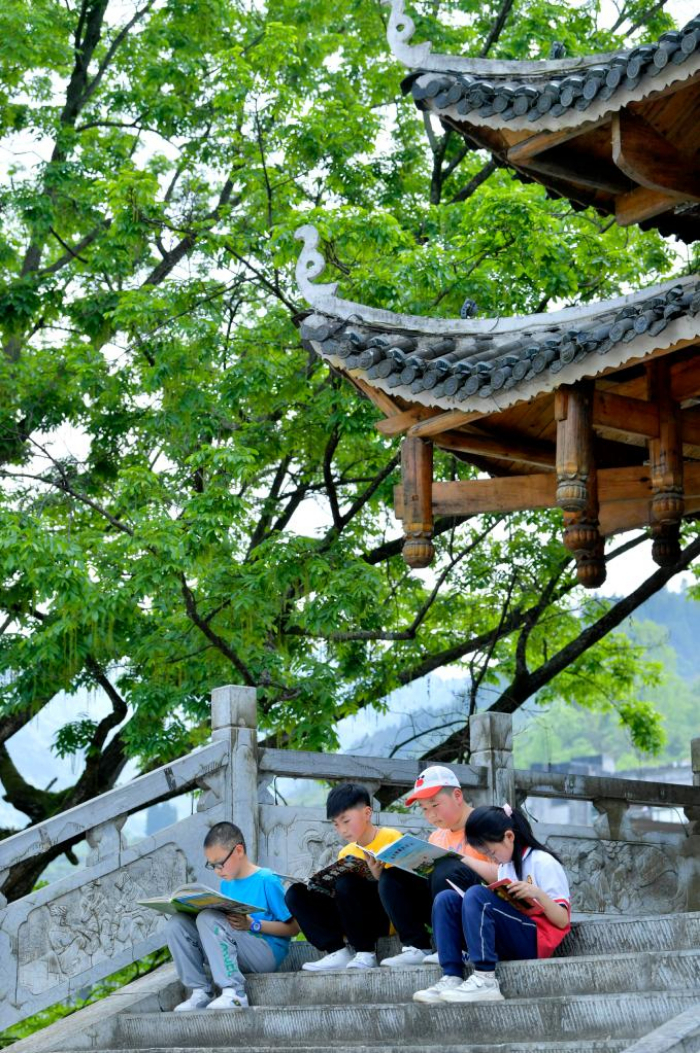 4月20日,在湖北省恩施土家族苗族自治州宣恩县高罗镇的风雨桥上,孩子们参加户外阅读。