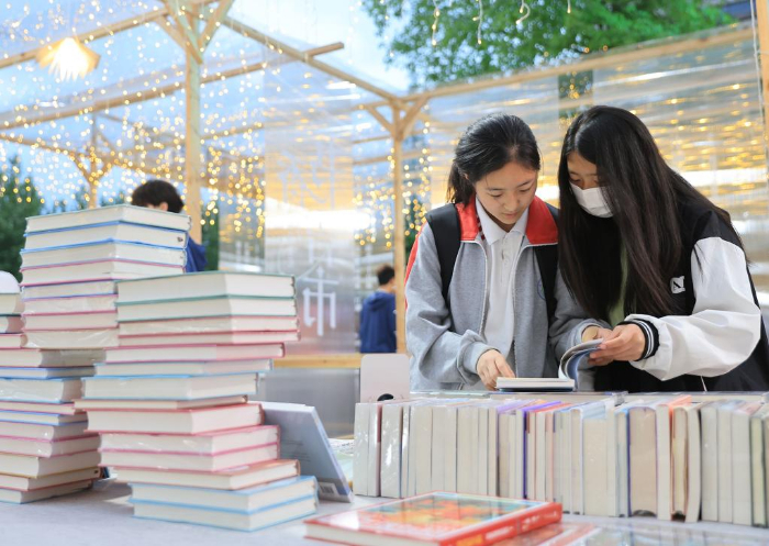 4月21日,在浙江省湖州市安吉县图书馆广场上,市民在“书香吉市”的线下书展上阅读、挑选书籍。