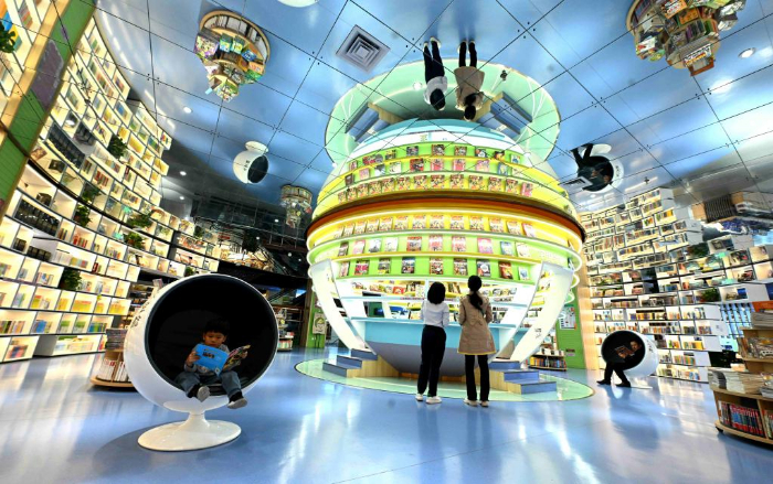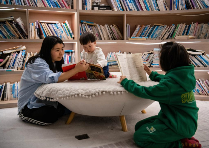 4月20日,在江苏省东台市七里漾书店儿童阅读专区,家长带领孩子读书。