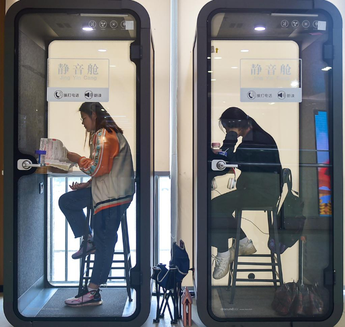 4月22日,读者在河南省洛阳市图书馆“静音舱”内读书学习,享受安静的阅读空间。
