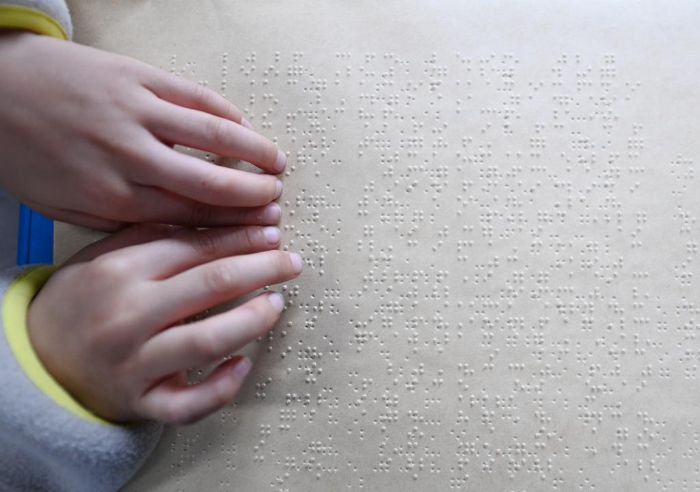 4月21日,湖北襄阳市特殊教育学校的视障学生在“阅读”盲文图书。