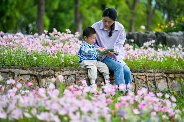4月22日,家长带着孩子在贵州省遵义市余庆县一公园内读书。