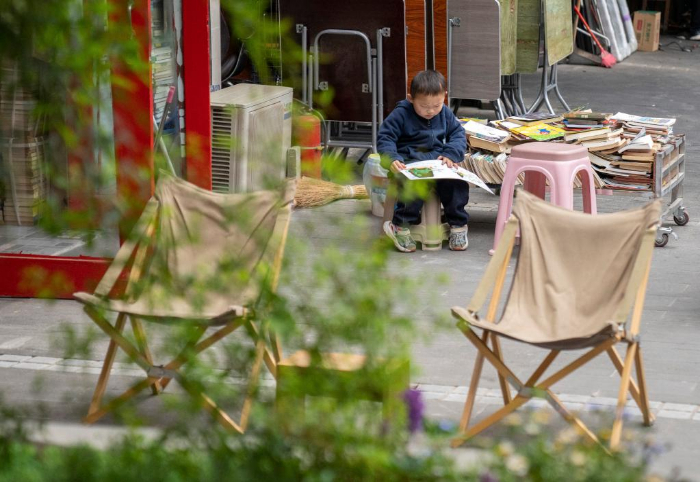 4月22日,一名小朋友在南京市一家二手书摊读书。