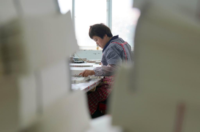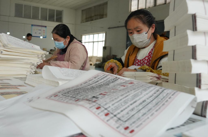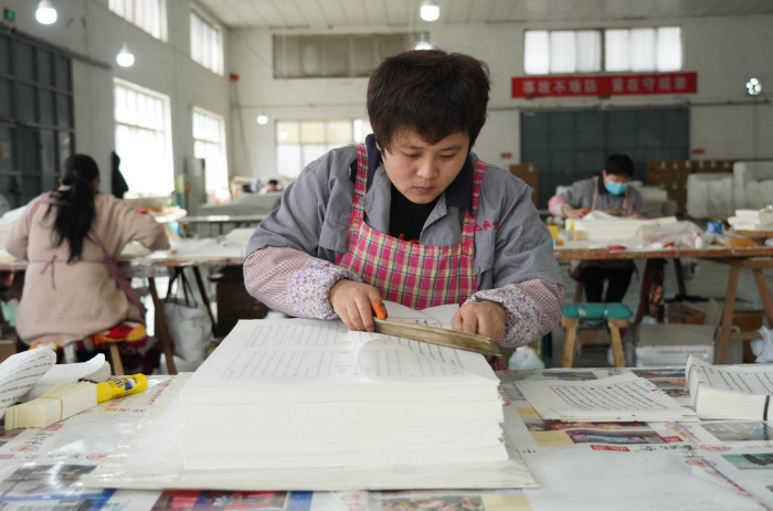 4月25日,河北南宫华宝古籍印刷有限公司工人在制作线装书。