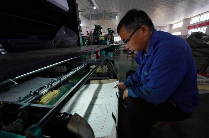 4月25日,河北南宫华宝古籍印刷有限公司工人在印刷线装书。