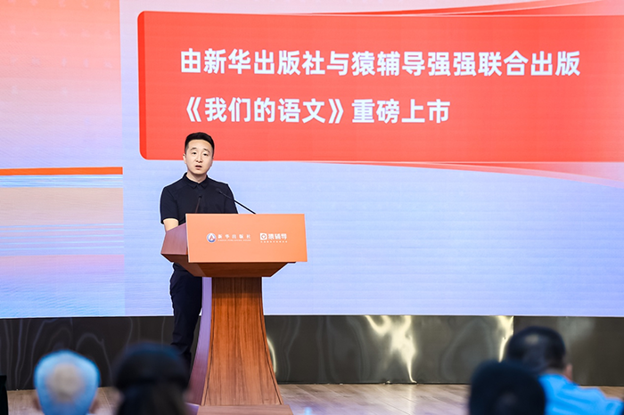 2023年6月19日,《我们的语文》新书研讨会暨新华出版社与猿辅导战略合作签约仪式在京举行。图为猿辅导联合创始人帅科致辞。