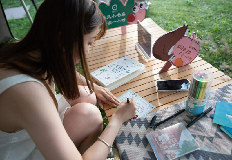 7月8日,在银川市森林公园,读者写下阅读感想。