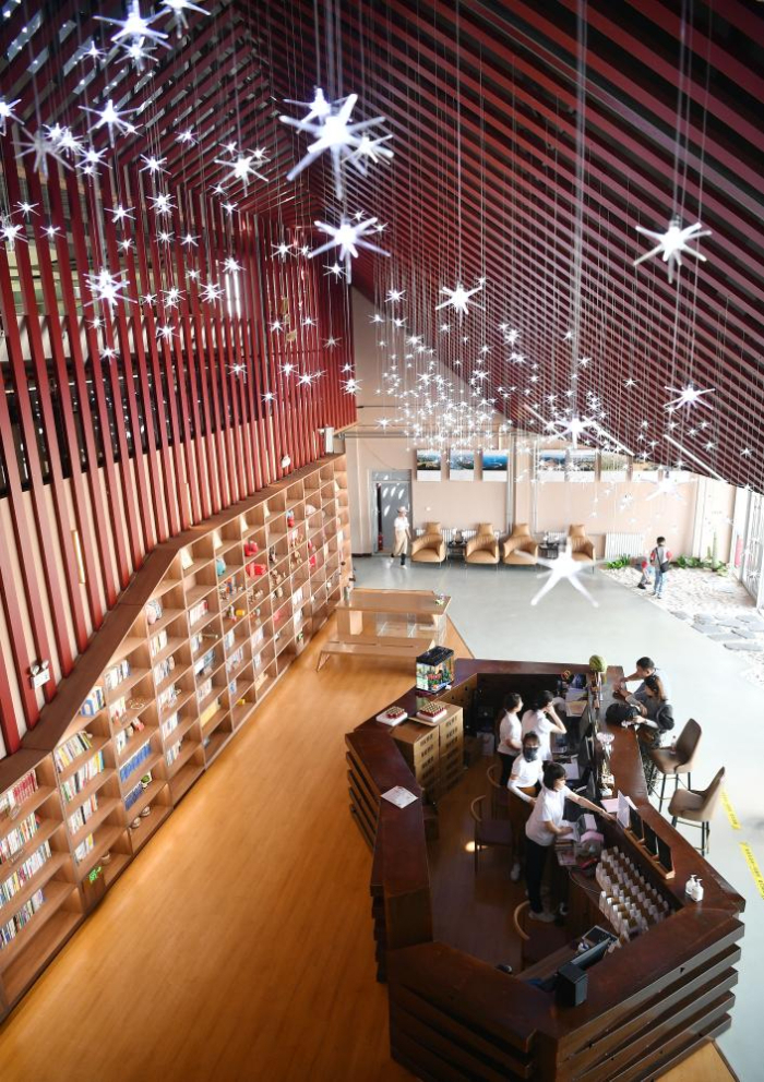 7月20日,工作人员在沙漠图书馆大厅给游客办理借书。