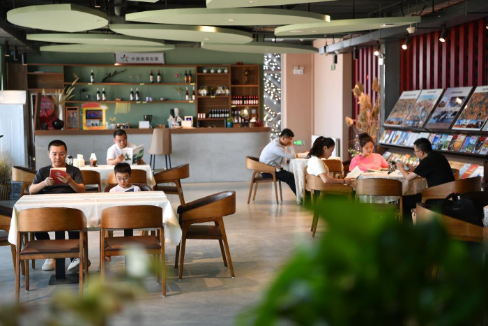 7月20日,游客在位于宁夏中卫市腾格里沙漠大漠星河度假区的沙漠图书馆看书。