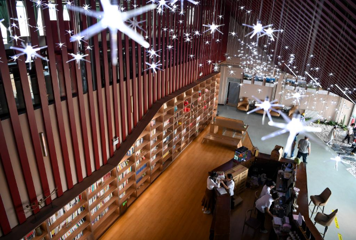 7月20日在宁夏中卫市腾格里沙漠大漠星河度假区拍摄的沙漠图书馆大厅。