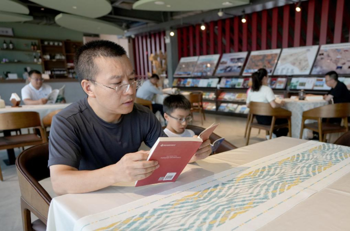 7月20日,来自四川成都的游客张青山与儿子一起在位于宁夏中卫市腾格里沙漠大漠星河度假区的沙漠图书馆看书。