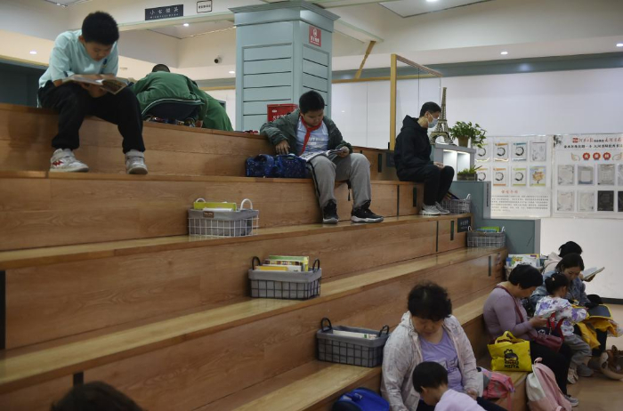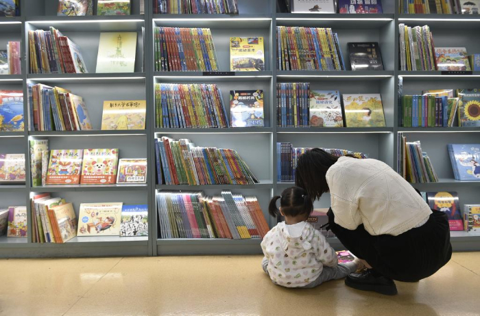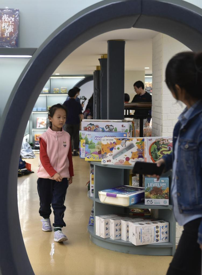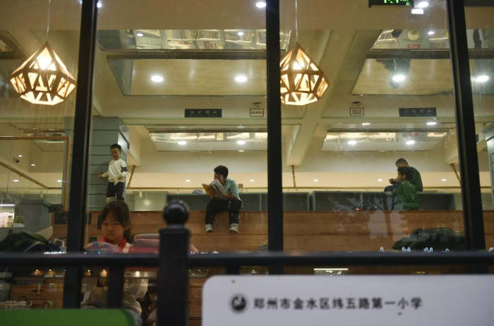10月18日,家长带着小朋友在郑州市纬五路第一小学校园阅读中心内阅读。