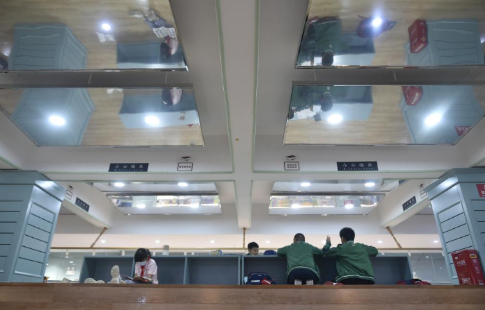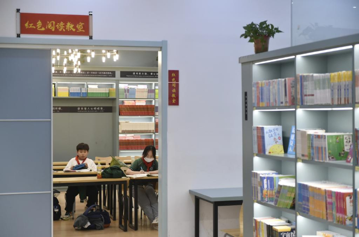 10月18日,小学生在郑州市纬五路第一小学校园阅读中心内阅读。