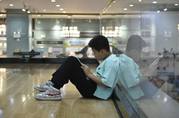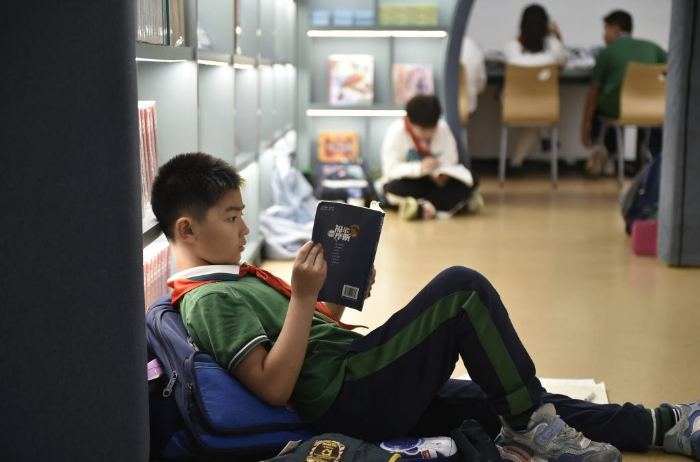 10月18日,一名小学生在郑州市纬五路第一小学校园阅读中心内阅读。