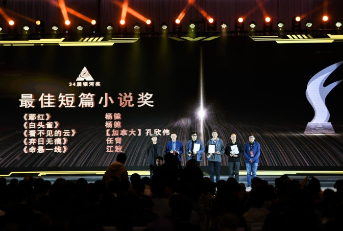 10月19日,在第34届中国科幻银河奖颁奖典礼上,嘉宾为获得最佳短篇小说奖的代表颁奖。