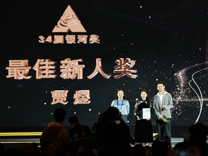 10月19日,在第34届中国科幻银河奖颁奖典礼上,嘉宾为获得最佳新人奖的代表颁奖。