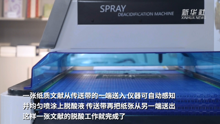 在齐鲁工业大学的古籍修复室内,古籍修复师正在用一台自动喷雾脱酸机对古籍文献进行脱酸处理。一张纸质文献从传送带的一端送入,仪器可自动感知,并均匀喷涂上脱酸液,传送带再把纸张从另一端送出。这样一张文献的脱酸工作就完成了。
