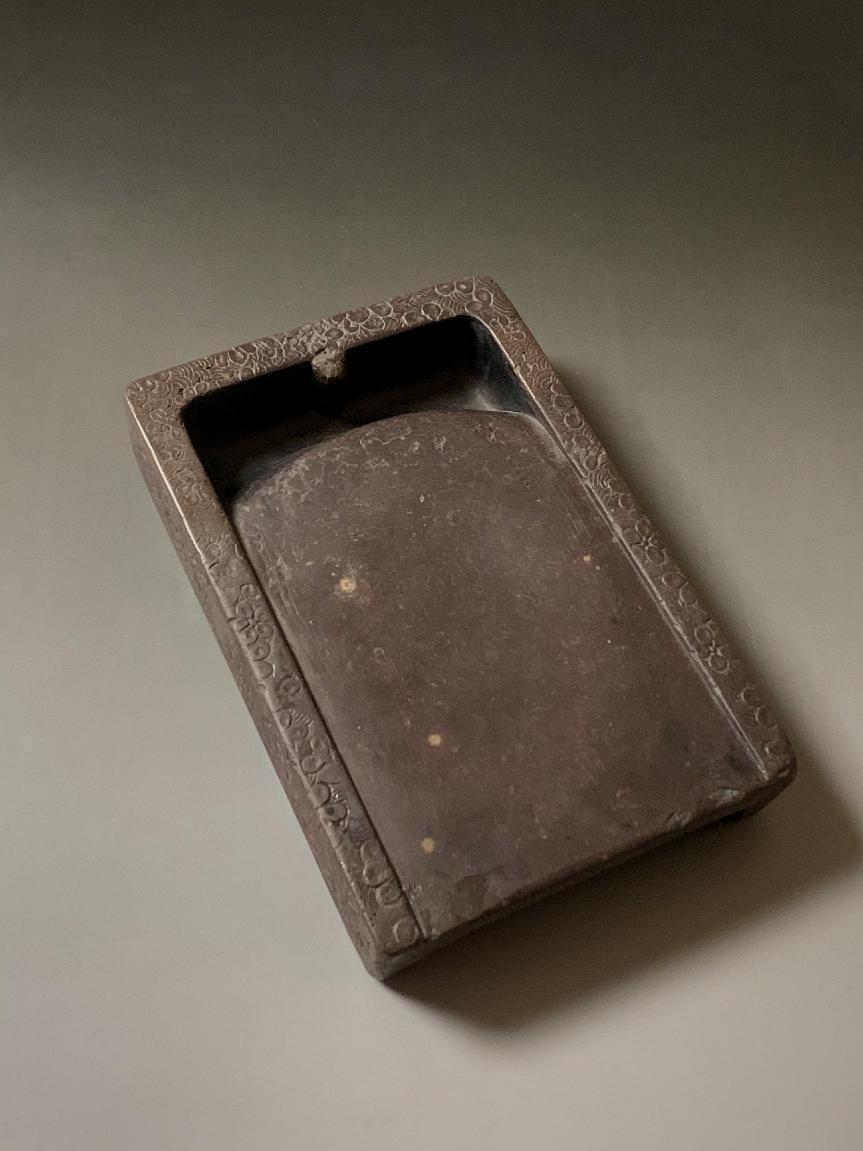 此砚四周满雕梅花。自古文人多爱梅,梅妻鹤子佳话不断。可想砚之主人对于梅花冒雪冲寒高超的品格的仰慕和喜爱,也是砚之主人高尚人格的追求和君子情怀的体现。细审该砚,梅花的雕刻比较独特,满砚梅花只见花瓣,不见繁枝密萼,地纹满饰海水纹,整朵的梅花夹以散落的花瓣自然飘落在海水纹上,让人自然联想起清代扬州八怪之一金冬心的画梅诗句:“偏是春风多狡狯,乱吹乱落乱沾泥”。也许是砚主不想让梅花沾泥,来吧,只有落到我的墨海里!