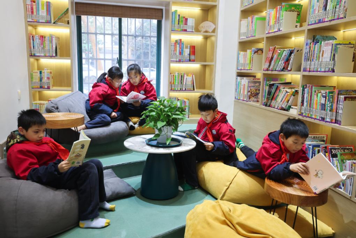 1月5日,湖州市飞英小学学生在飞英街道城市书房参加社区读书日活动。