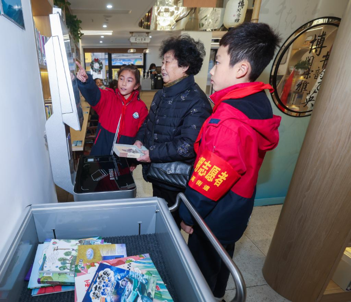 1月5日,湖州市飞英小学学生在飞英街道城市书房当一日“小馆员”志愿者,整理读者归还的书籍并引导读者借还书。