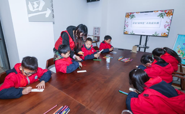 1月5日,湖州市飞英小学学生在老师的指导下制作“护苗·绿书签”,培养良好的阅读习惯。