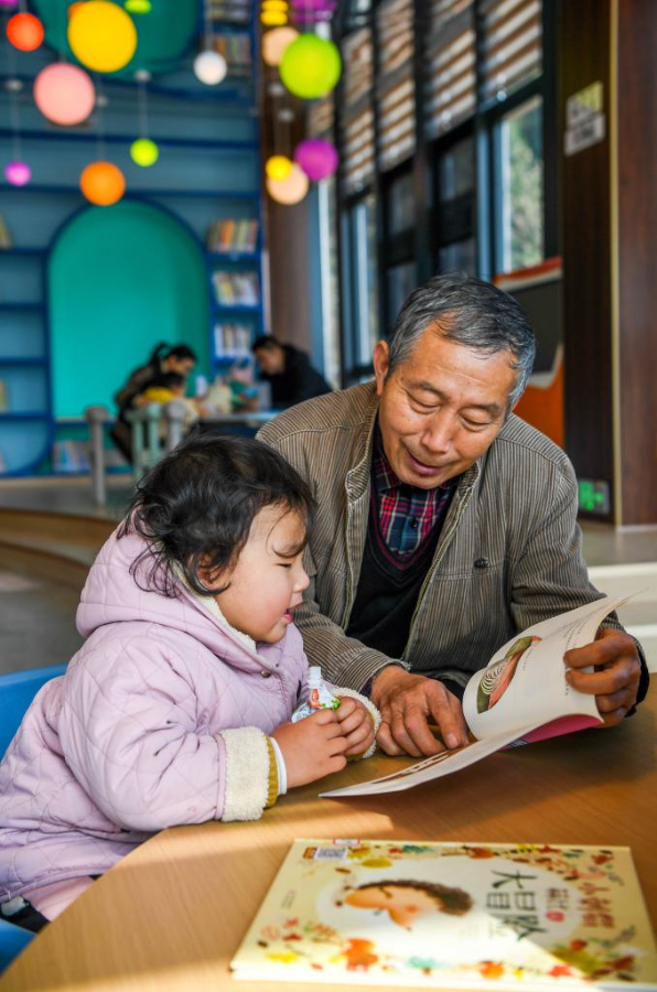 1月4日,一名家长带着孩子在江西省宜春市袁州区珠泉街道狮子山公园城市书房内阅读。