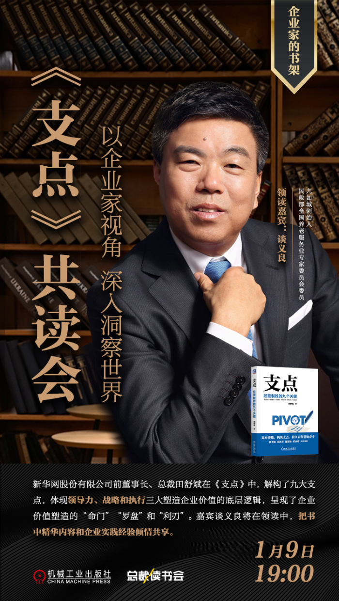 为了企业家更好地塑造企业价值,提升格局和眼界,1月9日19:00九如城创始人谈义良将领读《支点》一书,将在“认识管理”视频号上进行直播。通过如何从多维度视角塑造企业价值、如何提升企业家的格局和眼界、如何做好团队塑造,构筑人力资本基石三个方面,从企业家视角把书中精华内容和企业实践经验倾情共享,千万别错过。