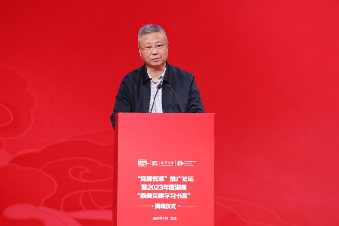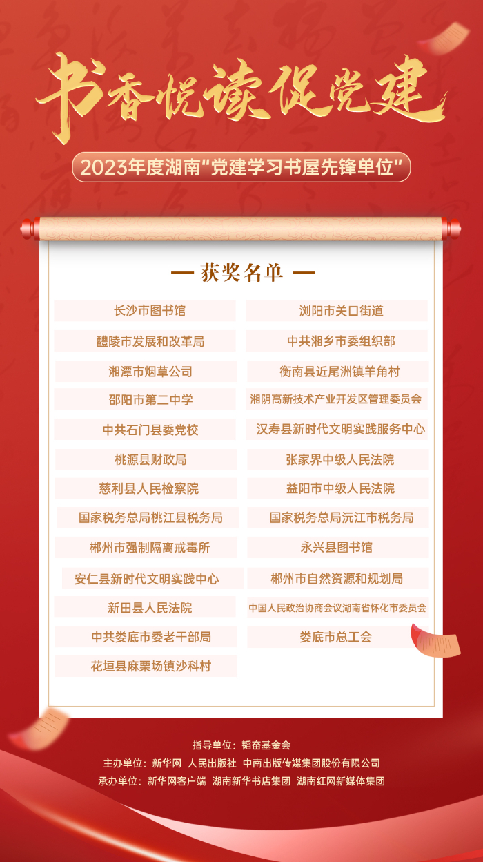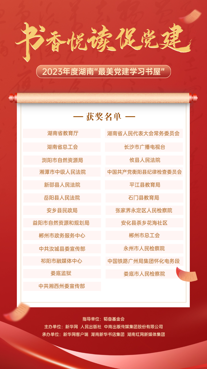 “党建悦读”推广论坛暨2023年度湖南“最美党建学习书屋”揭晓仪式由韬奋基金会指导,新华网、人民出版社、中南出版传媒集团股份有限公司主办,湖南新华书店集团、新华网客户端、新华网移动互联网事业群与湖南红网新媒体集团联合承办。