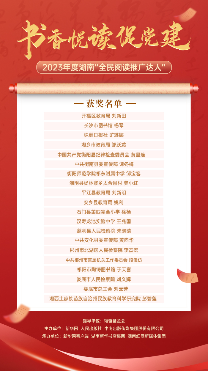 活动上公布了2023年度湖南“最美党建学习书屋”和“全民阅读推广达人”的获奖名单。目前,湖南已建成7000余家党建学习书屋,覆盖了各级党政机关、企事业单位、社会团体,是营造全民阅读氛围,建设各级学习型模范机关的重要平台。2023年度湖南“最美党建学习书屋”“全民阅读推广达人”评选活动自启动以来,获得湖南省各市州积极响应,经过组委会资格审查、专家初审,遴选出50家“党建学习书屋”,并推选出40名“全民阅读推广人”,进行集中展示和网络投票。根据网民票选结果,专家团队最终评出25家“最美党建学习书屋”、20名“全民阅读推广达人”并颁发奖杯及荣誉证书。