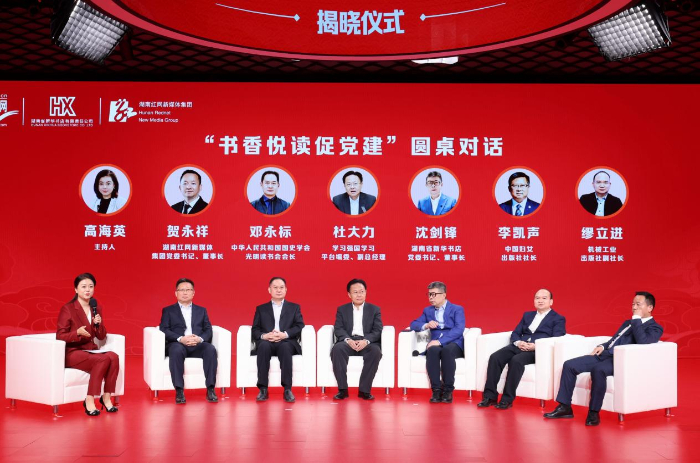 圆桌对话环节,学习强国学习平台编委、副总经理杜大力,中华人民共和国国史学会光明读书会会长邓永标,中国妇女出版社社长李凯声,机械工业出版社副社长、北京百万庄图书大厦有限公司董事长缪立进,湖南省新华书店党委书记、董事长沈剑锋,湖南红网新媒体集团党委书记、董事长贺永祥共同围绕“书香阅读促党建”这一主题,深入探讨了党建学习书屋建设对提升全民阅读的重要意义、如何鼓励社会各界人士参与到党建学习书屋的建设和运营等话题。最后,与会嘉宾分享了自己的阅读主张,呼吁全社会营造“爱读书、读好书、善读书”的浓厚氛围,共同书写全民阅读的美好未来。