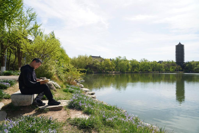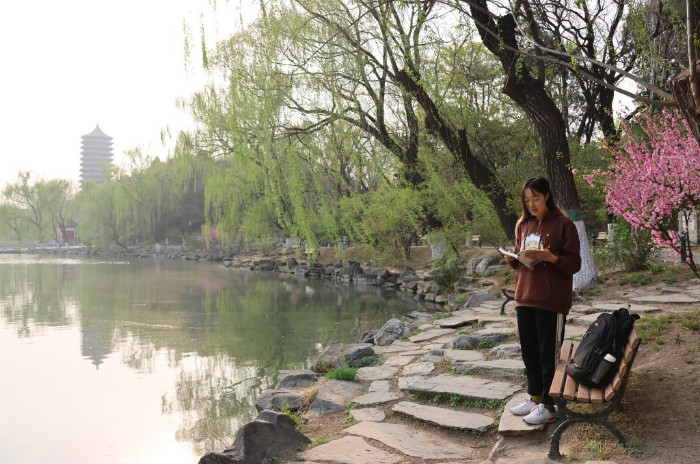 2024年4月8日,一名学生在未名湖畔晨读。