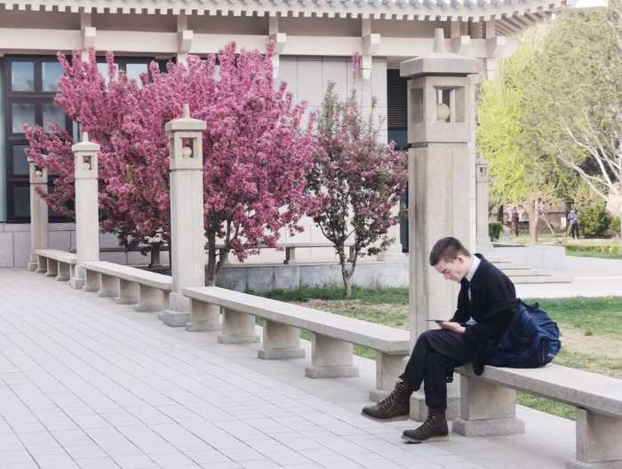 2024年4月9日,一名来自清华大学的美国留学生在北京大学图书馆门口阅读平板电脑上的内容。