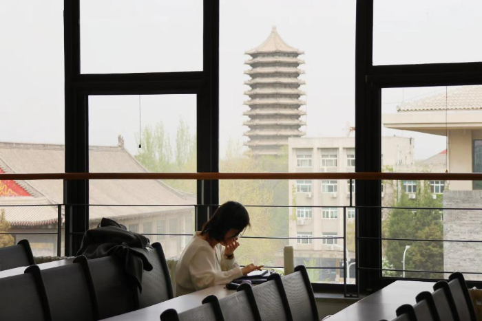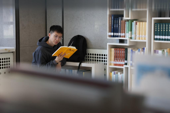 2024年4月8日,一名学生在北京大学图书馆新书展阅厅读书。在燕园