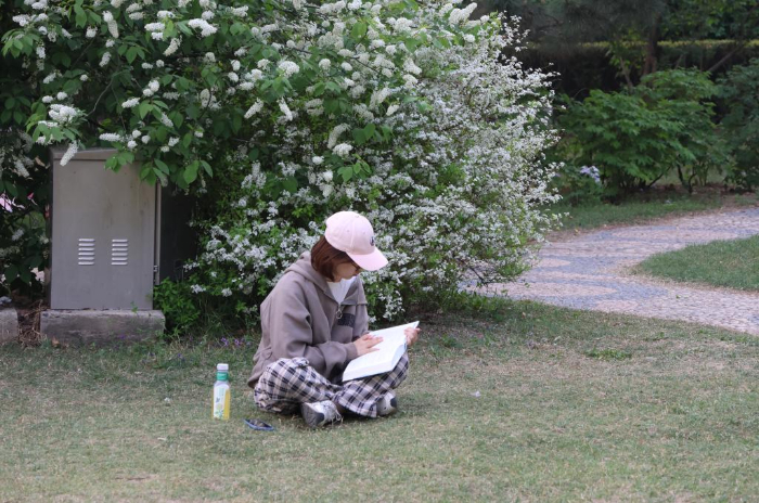 2024年4月13日,一名学生在北京大学静园草坪上读书。