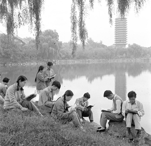 清晨的未名湖畔,学生们在读书(1961年摄)。
