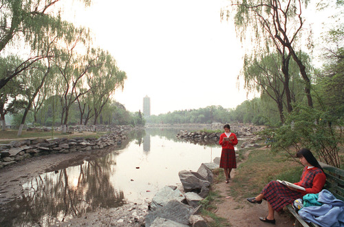 学生在未名湖畔晨读(1994年摄)。