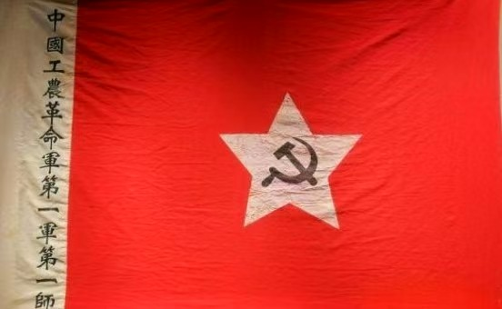 他们用布剪好镰刀斧头和五角星的图案,放在整面大红布的中央。然后,另剪一方长条白布,描出旗杆套的位置,再由杨立三从上到下工工整整地写上“工农革命军第一军第一师”的部队番号。最后,他们将这方长条白布,粘贴在整面大红布左部。一面庄重、神圣、鲜艳,凝聚着工农革命意义的军旗就这样诞生了。