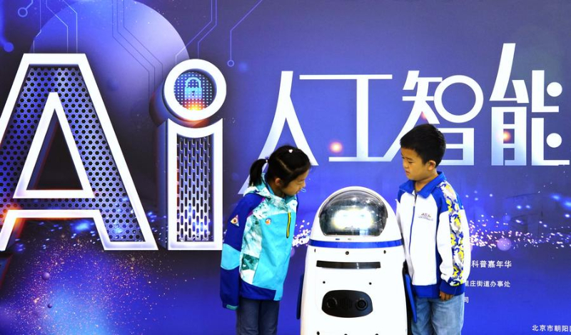 2024年5月25日,在北京日坛中学实验学校举办的科普嘉年华活动中,孩子们与机器人互动。新华社记者 李欣 摄