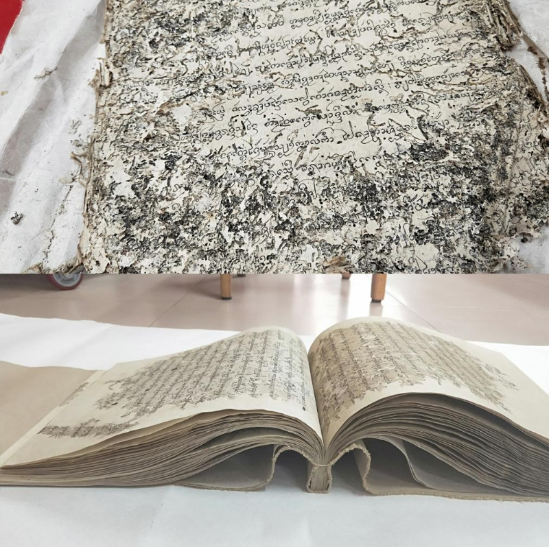 傣文古籍修复前后云南省古籍文献存量丰富,许多古籍历经岁月侵蚀,虫蛀发霉、破损严重。2012年以来,云南省古籍保护中心启动实施少数民族古籍修复志愿服务项目,吸纳高校、基层图书馆等机构的古籍修复人员参与修复工作,有力推进了全省古籍修复进程。