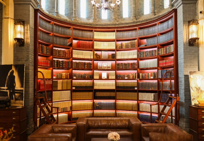 模范书局·诗空间选址于距今已有117年历史的中华圣公会教堂,是梁思成笔下清末极具代表性的中西合璧式建筑,经改造后成为了现如今的书店。教堂内装饰雅致,高耸的穹顶映衬着西式风情的玻璃窗,复古木地板与井然的书架交相辉映,中央的洗礼池经过改造后巧变舞台,为日后的活动预留空间。夏日炎炎,这里也变成了京城纳凉的好去处。