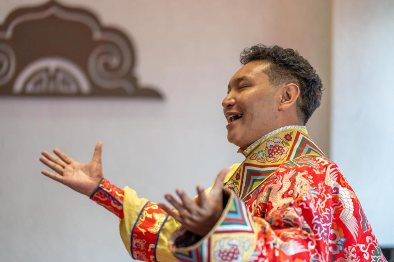 9月13日,格萨尔说唱艺人斯塔多吉在发布仪式现场表演格萨尔说唱。