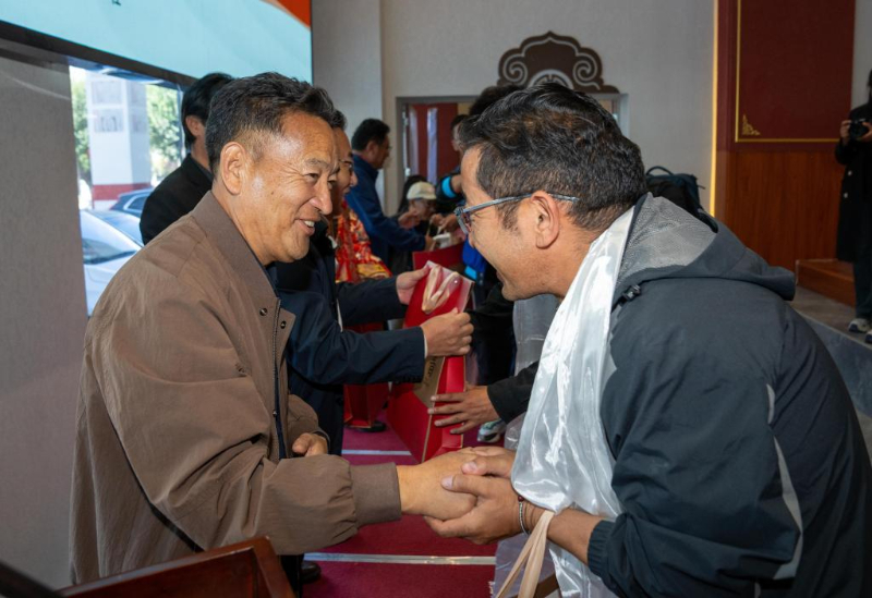 9月13日,参会专家向《格萨尔王传》系列丛书编辑人员敬献哈达。