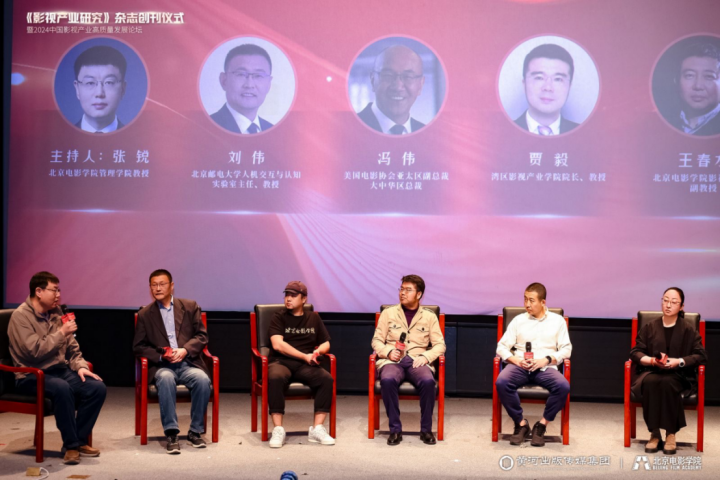 在圆桌论坛环节,围绕“AI视角电影产业的机遇和挑战”主题,嘉宾、主持人、北京电影学院管理学院副教授张锐,与北京邮电大学人机交互与认知实验室主任刘伟,北京电影学院博士后李乃乾,广东财经大学湾区影视产业学院院长贾毅,北京电影学院王春水副教授,北京电影学院薄一航副教授展开热烈讨论。