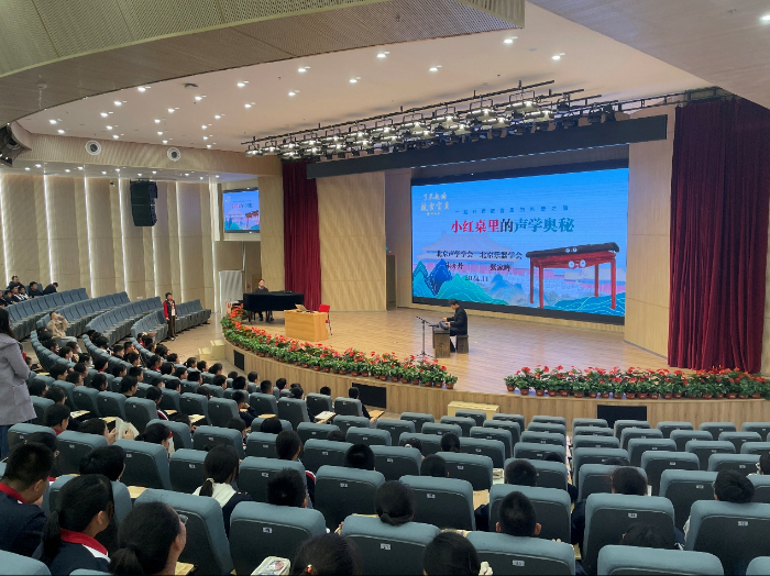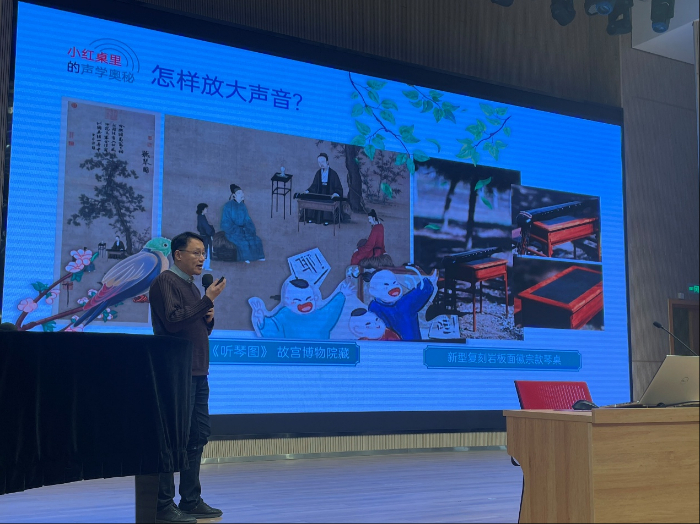 北京声学学会副秘书长朱亦丹以故宫藏品琴桌为对象展开“小红桌里的声学奥秘”主题宣讲,他借用文物乐器的发声、扩声规律,为同学们深入浅出地讲解了声学知识,将古典音乐的美学、乐器背后声学原理与现代科学进行关联,使主题分享生动有趣。