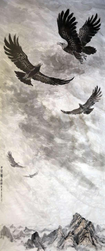 《中华腾飞图》画高3.65米,宽1.45米。这幅画将神鹰、乌云、长空、万里江山融为一体。君寿表示,这幅画是自己绘画生涯中最满意的一张。“背景是乌云而不是晴空,是这幅画的灵魂,这是以物喻人,平淡的天空不会给人以力量和激情。鹰就是要在暴风雨来的时候,不畏艰险,搏击长空。九万里风鹏正举,天地间任吾翱翔。”他说。