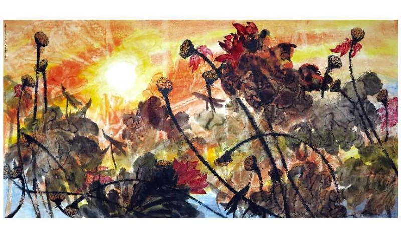 《金色荷塘》是一幅以独特艺术风格展现荷塘丰收景象的画作。君寿运用了奔放且富有变化的笔触。在描绘荷叶和荷花时,以粗犷的笔触展现出植物的质感和生命力;在表现阳光时,较为柔和且富有动感的笔触则营造出光线的流动感和温暖的氛围。这幅作品充分体现中国传统水墨画中写意的韵味,通过笔墨的运用表现出荷塘的神韵,又借鉴西方绘画中对色彩和光影的处理方式,使画面具有强烈的现代感和视觉张力。