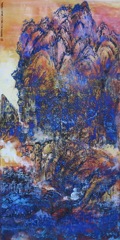 这幅《江山秋色图》别开生面地铺陈出层峦叠嶂间的斑斓气象。峰壑经霜而愈显苍劲,层林尽染中透出澄明秋意。君寿笔法雄浑刚健,勾勒皴擦间见骨力洞达。整幅画作打破传统秋景萧疏之境,于斑斓绚烂中见天地澄怀,让古典山水精神在时代语境中焕发出新的生命力。